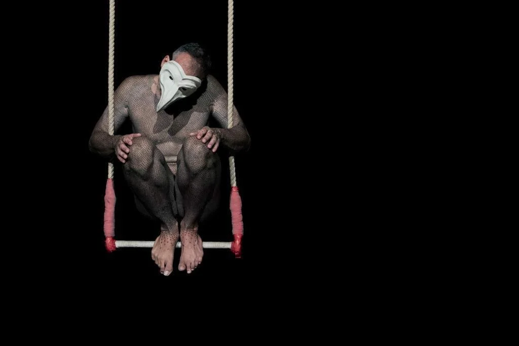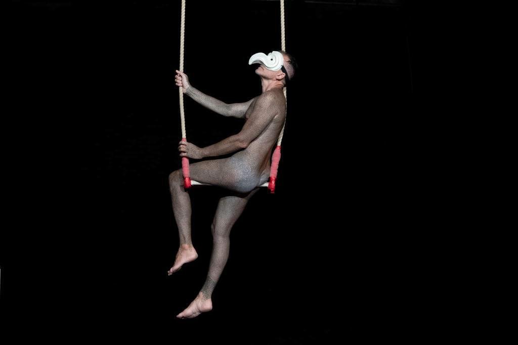 In una performance dove la figura, i sogni e le sensazioni del volatile sono protagonisti, la fotografa Sara Meliti immortala Alfredo Meschi mentre indossa una maschera Centocani creata appositamente per l'occasione.