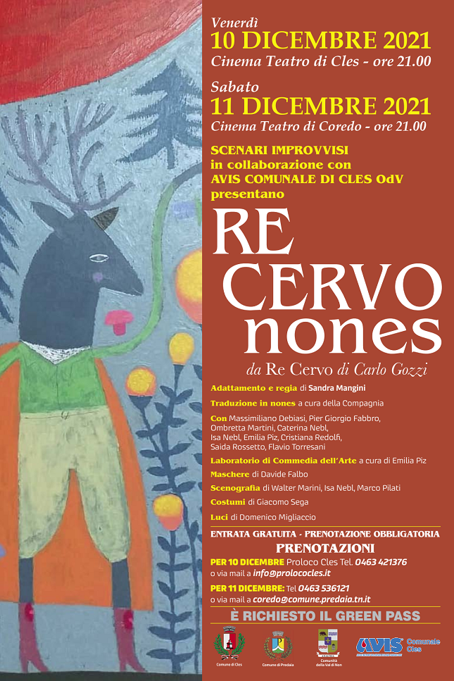"Scenari Improvvisi" è un’associazione nata per valorizzare attraverso il teatro e tutte le sue forme la cultura e il dialetto della Val di Non e che nel 2021 ha proposto a Centocani una collaborazione per la realizzazione delle maschere per lo spettacolo "Re Cervo Nones" una rielaborazione del Re Cervo di Carlo Gozzi in salsa e in dialetto della Val di Non per la Regia di Sandra Mangini.